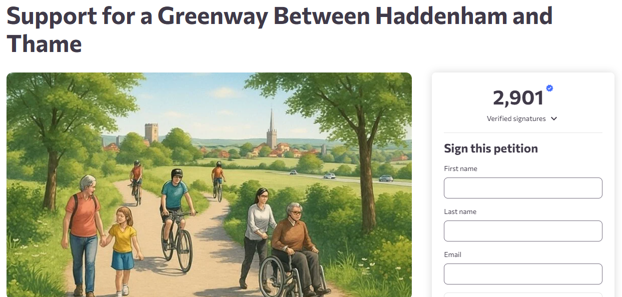The Greenway Group, which is campaigning for a walking, wheeling and cycling route between Thame and Haddenham, has received an encouraging response to the petition launched at the end of August: over 2,900 people have signed. Many people will be aware that the Greenway has been under consideration by Buckinghamshire and Oxfordshire councils for over 20 years. We are assured that the project is live and that work is actively taking place on route options. However, we would like to demonstrate to our elected representatives the strength of support for being able to reach our neighbouring community safely and healthily without resorting to motorised transport or having to face the dangers of the main roads between Thame and Haddenham.