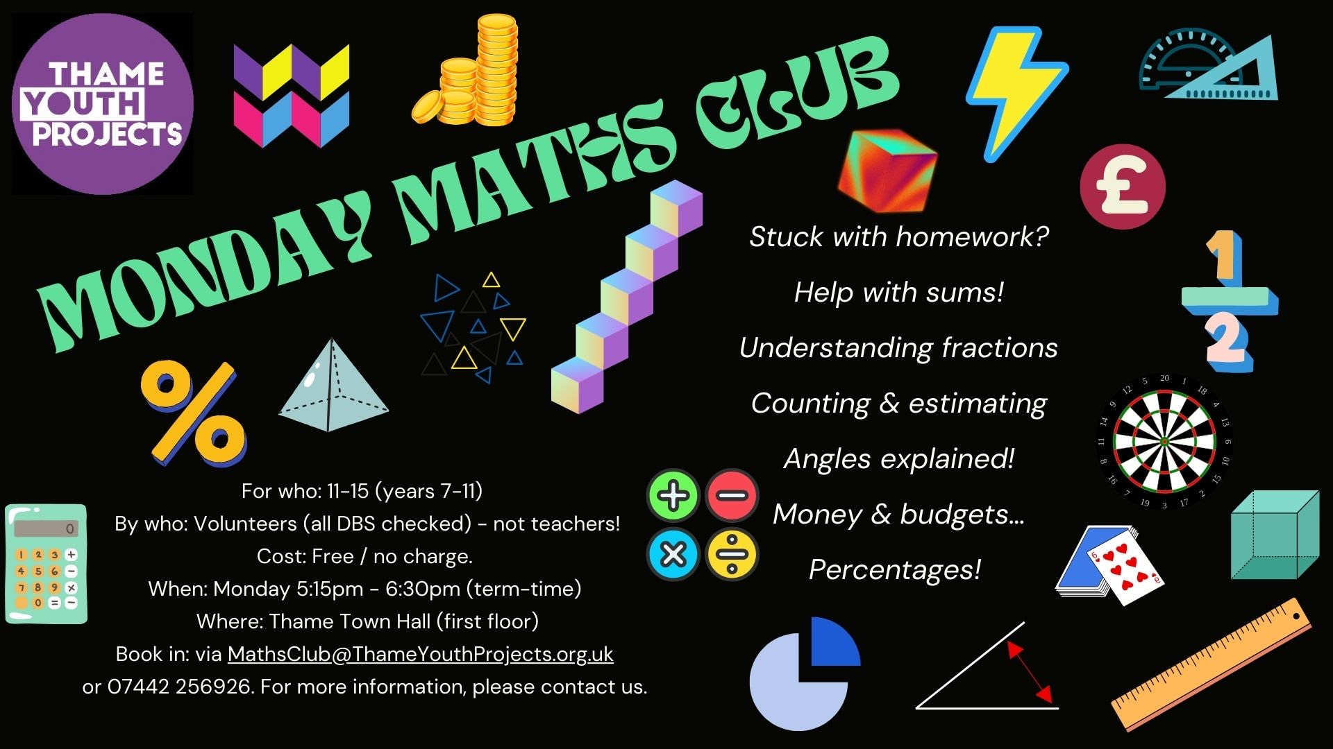 A free Monday Maths Club is now running at Thame Town Hall for young people aged 11–15 (Years 7–11).